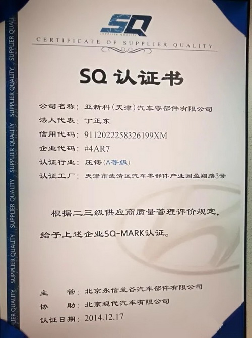 亚新科天津获得现代汽车SQ-MARK认证A级供应商